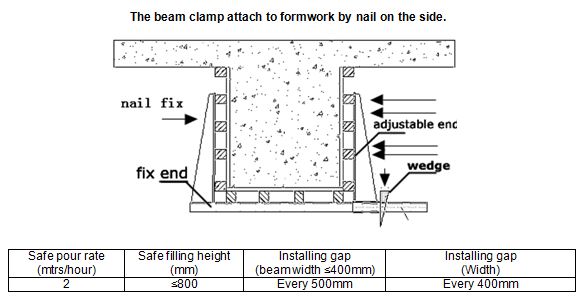 Para sujetar el encofrado de vigas, elija la abrazadera de viga de la dimensión correcta disponible de 200 mm a 600 mm, coloque el extremo fijo y el fondo contra el encofrado.Empuje el extremo ajustable contra el otro lado de la viga, inserte la cuña y sujete la abrazadera golpeando la cuña con un martillo.